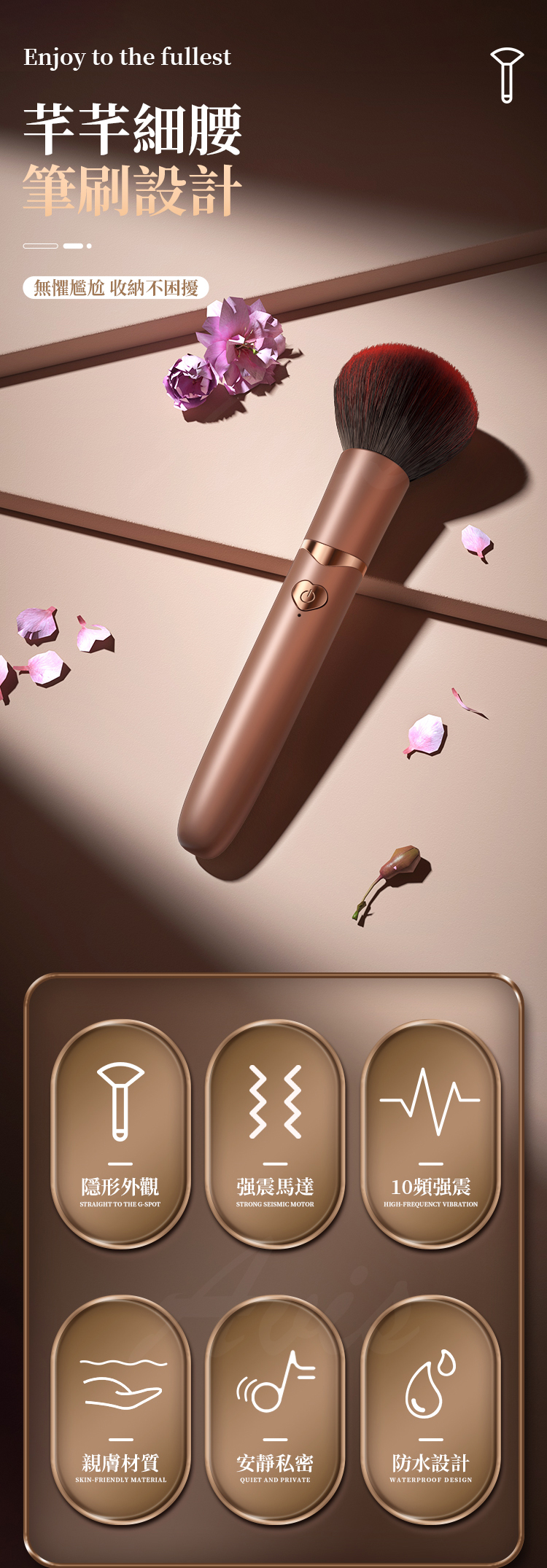 - 蜜粉刷設計:外觀精緻優雅,毫無尷尬,輕鬆隨身攜帶,隱秘性極佳!